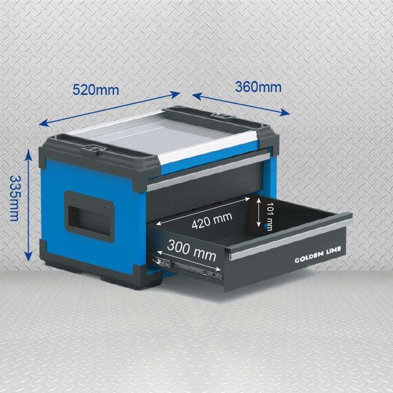 The foldable side handle allows for effortless mobility, while the reinforced aluminum trim and side cover protect against wear and tear. Move it easily on four 2-inch swivel casters, two of which include brakes for secure positioning. Plus, the plastic side tray keeps fasteners and accessories organized and accessible, making your workflow smoother.