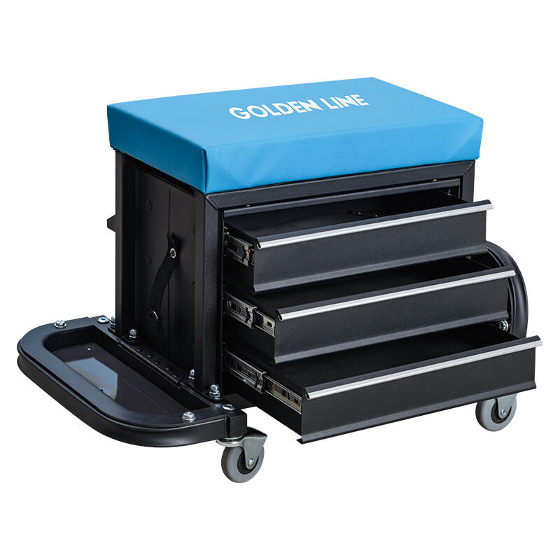 The GL404 Metal Tool Cabinet Tool Cart With Draws And Seats is a practical and functional storage solution designed for garages and workshops. This tool cabinet features three drawers of varying sizes that provide ample space for storing a wide range of tools and equipment. The drawers are made from high-quality materials and are designed to be durable and long-lasting. They also feature ball-bearing slides, which ensure that the drawers open and close smoothly.